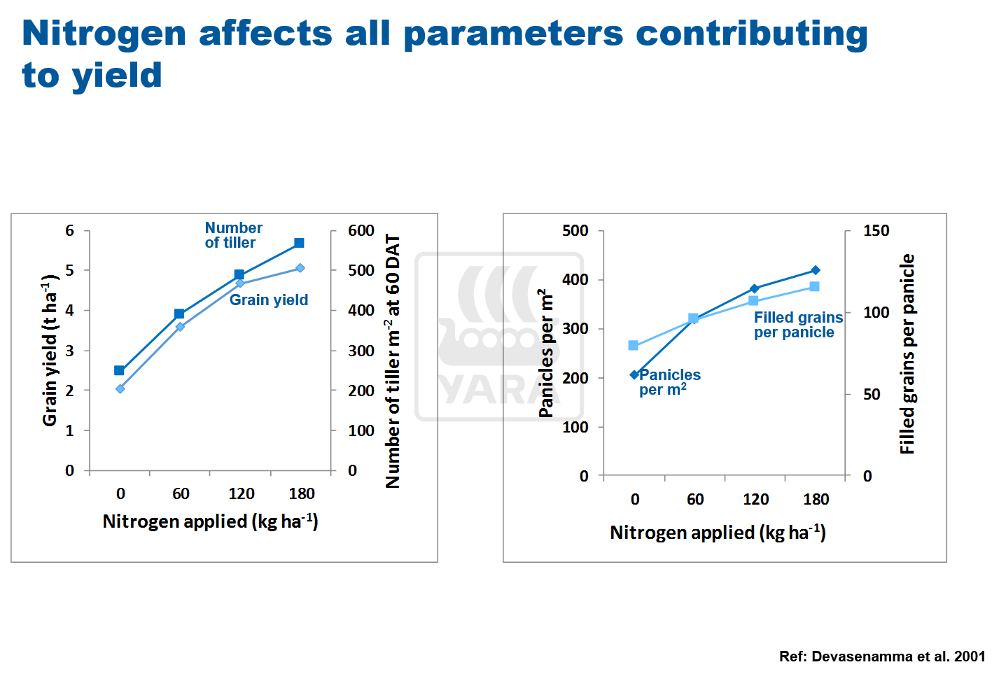 Nitrogen affects all parameters contributing to yield (e.g. spikelet number per panicle, percentage of filled spikelets, grain protein content:
