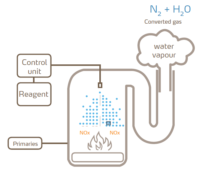 • distributing the reagent centrally inside the boiler