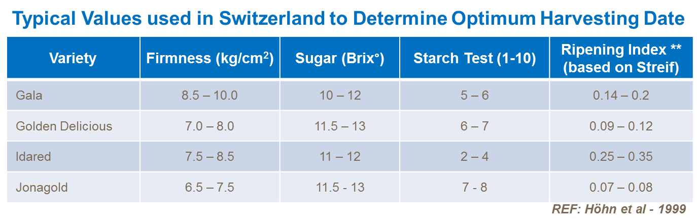 Each country has developed its own standard procedures to determine the right time to pick apples and pears. Various indices have been devised, but because there are considerable variations in a wide number of quality parameters each year, considerable practical experience is needed when determining best harvest date.