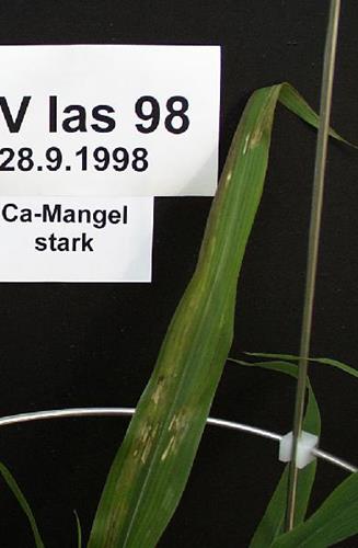 Symptoms start on younger leaves. Leaf tips show light green or whitish spots or streaky lesions and are often hooked back.
