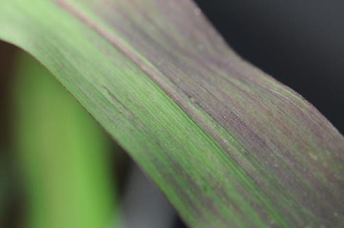 Tissue on the leaf base and along the main vein is dark green, while the marginal, interveinal area towards the leaf tip shows a distinct purple tint. By the time, the discoloration spreads over the entire leaf blade.