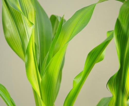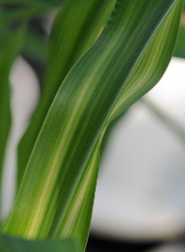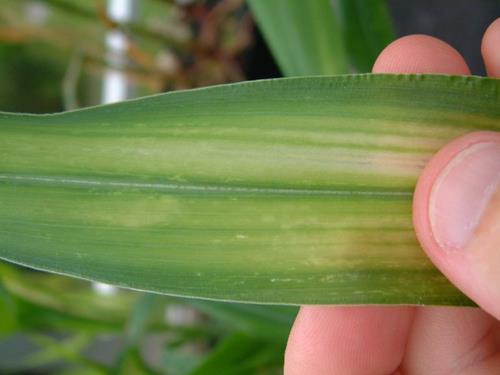 Pale yellow-white chlorotic zones run parallel to the midrib starting at base of leaves, giving the leaf a streaky appearance.