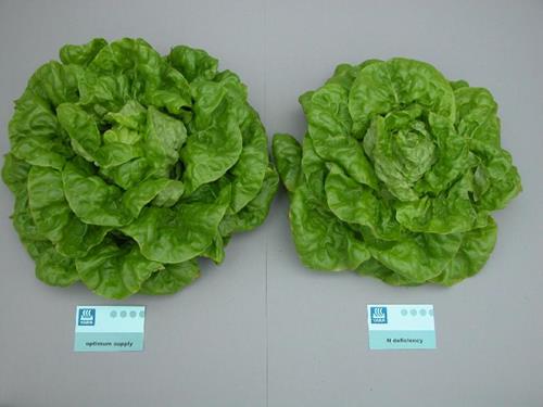 Symptoms of nitrogen deficiency start on older leaves with light green clorosis. Later the whole head is affected and looks yellow green.