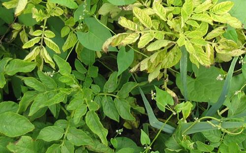 Fe deficiency is marked by pale green and yellow color of the youngest leaves, while the veins remain darker green (intercostal chlorosis).