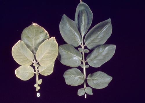 The pale green/yellow leaves (left) are reduced in size and growth may be stunted. Often seen on younger leaves first.