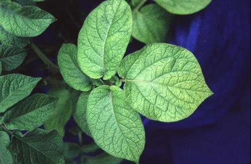 The pale green leaves (left) are reduced in size and growth is stunted. Symptoms often seen on younger leaves first.