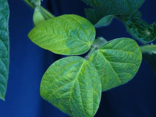 Several leaves of different age show a light green to yellow chlorosis, spreading irregularly over the leaf blade.