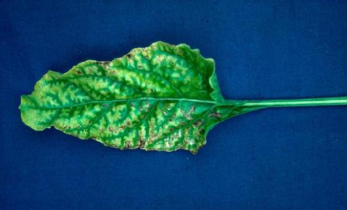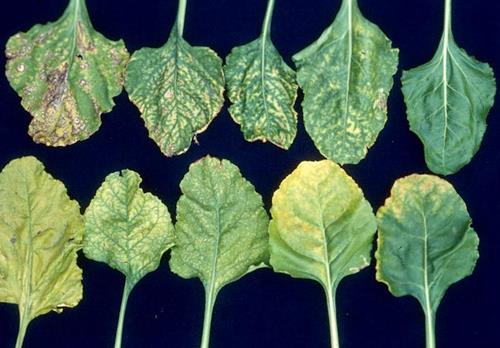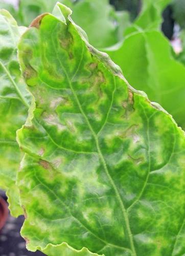 An infestation with beet yellow virus (BYV) or beet mild yellow virus (BMYV) causes similar symptoms to Mg deficiency, but in this case chlorosis starts from the leaf tips and the veins do not remain green.